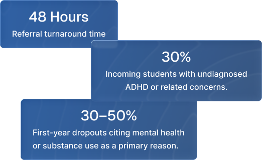 Early identification of ADHD, depression, anxiety, and substance use supports student success while protecting family investment and preventing revenue loss from dropouts.