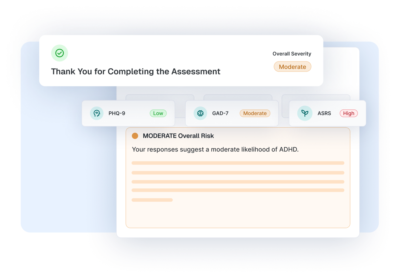 We use the world’s only FDA cleared online ADHD assessment tool that simultaneously measures hyperactivity, inattention, and impulse control. This tool provides clear, objective data about the core symptoms of ADHD. We also use validated rating scales like the ASRS, PHQ-9, and GAD-7, and structured diagnostic interviews. The result: a comprehensive, personalized report that’s fast, clear, and clinically rigorous.